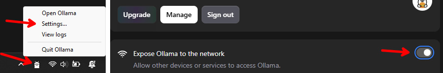 Para permitir conexões de outros IPs, acesse as configurações do Ollama e marque a opção “Expose Ollama to the network” (Expor o Ollama à rede).