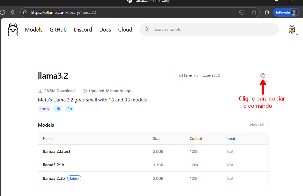 Após selecionar o modelo desejado, clique no ícone indicado na imagem para copiar o comando a ser utilizado: